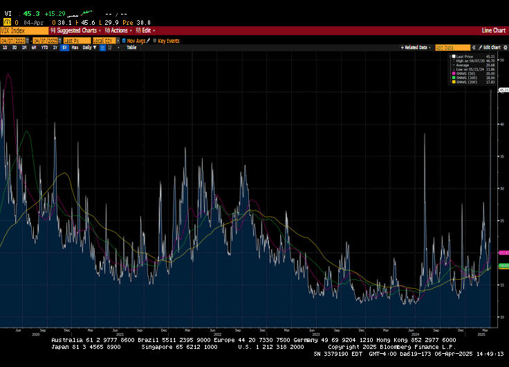 Global financial markets tumbled last week as investors moved out of risk assets, fearing that a worldwide trade war would ensue after Trump’s tariffs were higher than anticipated.  Thursday and Friday’s market action resulted in a $5.4 trillion loss in US market capitalization.  Q1-2025 ended on Monday, marking the worst quarter since 2022, and March was also the worst month since 2022.  The first quarter was also the worst quarter for US stocks when compared to the rest of the world’s equity indices since 2009.  Have we seen peak uncertainty in the markets? That is the question many on Wall Street are contemplating.  Now that the US has announced its tariffs, will other countries retaliate with their own tariffs?  China imposed a 34% tariff in response to the announcement that the US would levy an additional 34% on Chinese goods, resulting in an overall duty of 54% on Chinese goods.  On the other hand, Vietnam and Cambodia announced that they would eliminate tariffs on US goods and sought to negotiate with the US to remove the announced tariffs.  I am in the camp that negotiations will be ongoing, and in the end, overall global tariffs will be reduced.  That said, the current narrative is that these announced tariffs will increase inflation, slow global growth, and perhaps tip several economies into recession.  According to a survey from Bloomberg, economists have increased the probability of recession in the next year to 30% from 20% at the end of 2024.  The idea of slower growth means that corporate earnings are likely to be revised lower in the coming months as first-quarter earnings are announced. This may lead to another leg lower for the market, although some of this has likely already been priced into the market.  Investors should expect increased volatility in the coming weeks as retaliatory tariffs are announced and negotiations result in new levels of duties.  The volatility index (VIX) spiked to 45, the highest level since the Covid-19 pandemic hit the markets in March 2020.  I would expect some moderation in the VIX over the coming days and weeks, but I anticipate it will remain elevated for the next couple of months.